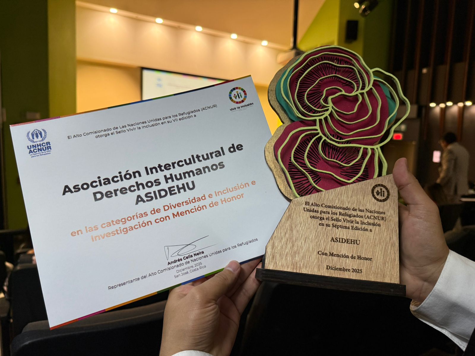El Sello Vivir la Inclusión no solo reconoció a Asidehu en sus dos categorías principales —“Diversidad e Inclusión” e “Investigación”— sino que también le otorgó una Mención de Honor por su tenaz incidencia en la mejora de políticas públicas y la defensa diaria de las personas refugiadas.
